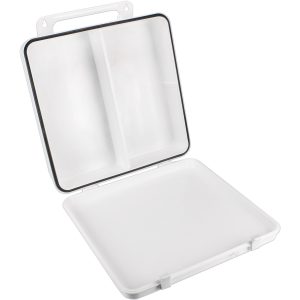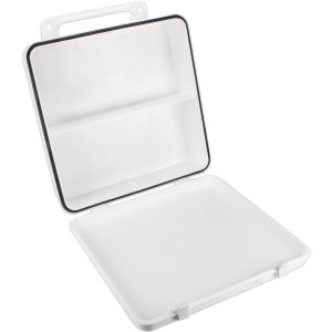 This empty plastic first aid case holds up to 24-units of product and features a gasket and polypropylene handle hanger.