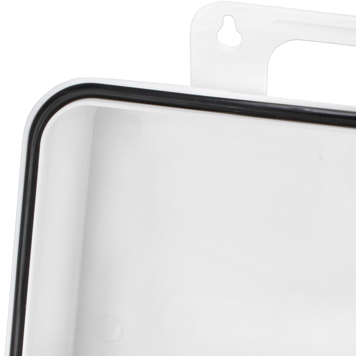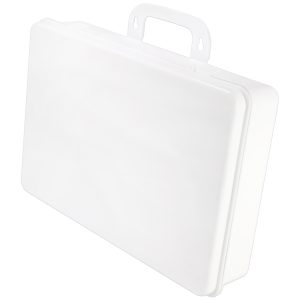 This empty plastic first aid case holds up to 36-units of product and features a gasket and polypropylene handle hanger.