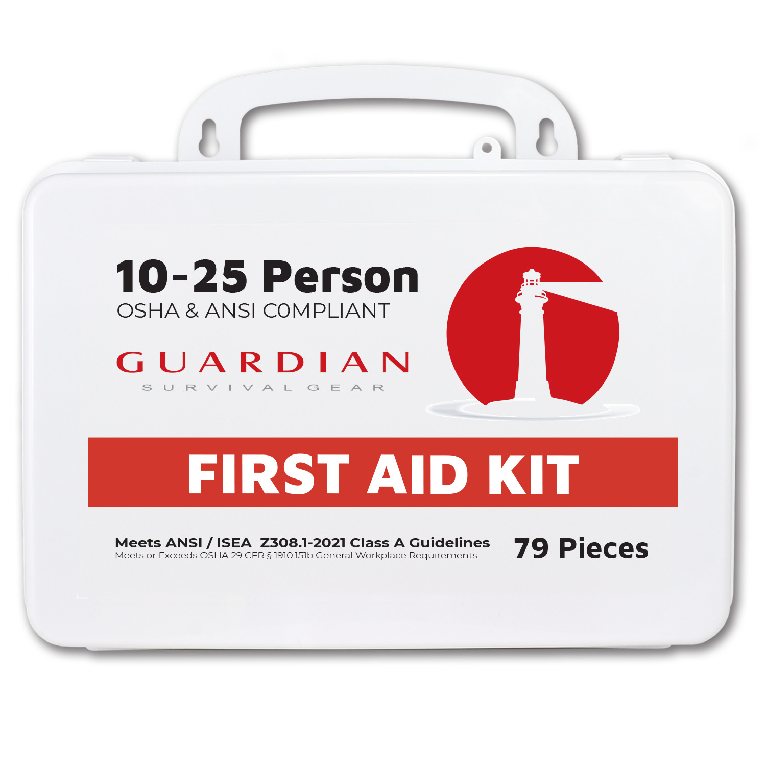 79 Piece ANSI Class A, 10 to 25 Person, in a lightweight, yet durable gasketed plastic case that is both portable and wall mountable. Meets requirements for ANSI case types I, II, III.